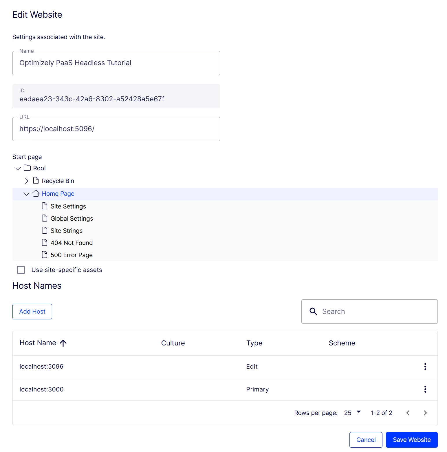 },Finally, go to "Manage Websites" and define hosts for both the CMS and the frontend apps. Set this up correctly or the CMS won't be able to display previews from a different host.